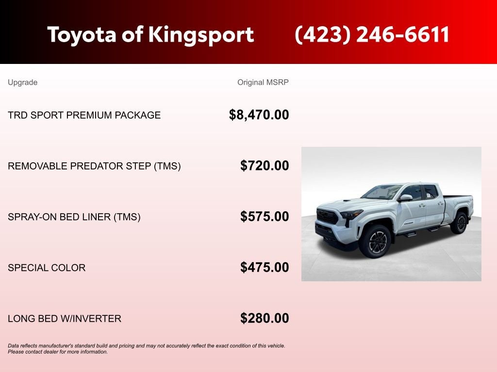 34. Projected EPA-estimated 20 city/26 highway/23 combined mpg rating for 2026 Tacoma SR 4x2 2.4L i-FORCE automatic; projected EPA-estimated 19 city/24 highway/21 combined mpg rating for 2026 Tacoma SR, SR5 4x4 2.4L i-FORCE automatic; projected EPA-estimated 18 city/23 highway/20 combined mpg rating for 2026 Tacoma SR 4x2, TRD Sport 4x2, TRD Off-Road 4x4 2.4L i-FORCE manual; projected EPA-estimated 21 city/26 highway/23 combined mpg rating for 2026 Tacoma SR5 4x2 2.4L i-FORCE automatic; projected EPA-estimated 20 city/24 highway/22 combined mpg rating for 2026 Tacoma TRD PreRunner, TRD Sport 4x2 2.4L i-FORCE automatic; projected EPA-estimated 19 city/23 highway/21 combined mpg rating for 2026 Tacoma TRD Sport, TRD Off-Road 4x4 2.4L i-FORCE automatic; projected EPA-estimated 19 city/23 highway/21 combined mpg rating for 2026 Tacoma TRD Off-Road 4x4 2.4L i-FORCE automatic; and projected EPA-estimated 20 city/23 highway/21 combined mpg rating for 2026 Tacoma Limited 4x4 2.4L i-FORCE automatic as determined by manufacturer. Projected EPA-estimated 22 city/24 highway/23 combined mpg rating for 2026 Tacoma TRD Sport, TRD Off-Road, Trailhunter, TRD Pro 4x4 2.4L i-FORCE MAX automatic as determined by manufacturer; projected EPA-estimated 23 city/24 highway/23 combined mpg rating for 2026 Tacoma Limited 4x4 2.4L i-FORCE MAX automatic as determined by manufacturer. EPA estimates not available at time of posting. Use for comparison purposes only. Your mileage will vary for many reasons, including your vehicle’s condition and how/where you drive. See www.fueleconomy.gov.