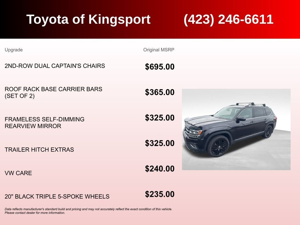 20 Black Triple 5-Spoke Wheels (Wheels: 20 Black Triple 5-Spoke Alloy), 12 Speakers, 2nd-Row Dual Captain's Chairs, 3.60 Axle Ratio, 3rd row seats: split-bench, 4-Wheel Disc Brakes, ABS brakes, Active Blind Spot Monitor, Air Conditioning, Alloy wheels, AM/FM radio: SiriusXM, Auto High-beam Headlights, Auto-dimming Rear-View mirror, Automatic temperature control, Brake assist, Bumpers: body-color, Compass, Delay-off headlights, Driver door bin, Driver vanity mirror, Dual front impact airbags, Dual front side impact airbags, Electronic Stability Control, Emergency communication system: VW Car-Net services (capabilities require enrollment or subscription), Forward collision: FCW w/Autonomous Emergency Braking mitigation, Four wheel independent suspension, Frameless Self-Dimming Rearview Mirror, Front anti-roll bar, Front Bucket Seats, Front Center Armrest, Front dual zone A/C, Front fog lights, Front reading lights, Garage door transmitter: HomeLink, Heated door mirrors, Heated front seats, Heated rear seats, Heated steering wheel, Htd/Actively Ventilated Comfort Front Bucket Seats, Illuminated entry, Low tire pressure warning, Memory seat, Navigation System, Occupant sensing airbag, Outside temperature display, Overhead airbag, Overhead console, Panic alarm, Passenger door bin, Passenger vanity mirror, Perforated Vienna Leather Seating Surfaces, Power door mirrors, Power driver seat, Power Liftgate, Power moonroof, Power passenger seat, Power steering, Power windows, Radio data system, Radio: Discover Media 8.0 Touchscreen w/Nav, Rain sensing wipers, Rear air conditioning, Rear anti-roll bar, Rear audio controls, Rear reading lights, Rear seat center armrest, Rear window defroster, Rear window wiper, Remote CD player, Remote keyless entry, Roadside Assistance Kit, Roof Rack Base Carrier Bars (Set of 2), Roof rack: rails only, Security system, Speed control, Speed-sensing steering, Split folding rear seat, Spoiler, Standard Suspension, Steering wheel mounted audio controls, Tachometer, Telescoping steering wheel, Tilt steering wheel, Traction control, Trailer Hitch Extras (DISC), Trip computer, Turn signal indicator mirrors, Variably intermittent wipers, Ventilated front seats, VW Care, and Wheels: 20 Silver Triple 5-Spoke Alloy.