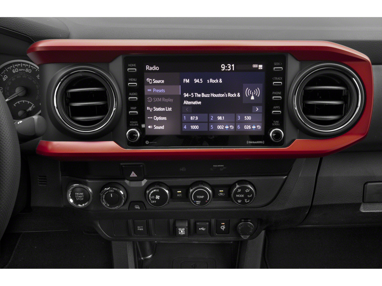 TRD Sport Package (120V/400W Deck Mounted AC Power, Color-Keyed Overfenders, Engine Immobilizer, and Power Sliding Rear Window w/Privacy Glass), Toyota Certified, 4WD, 17 Machined Alloy Wheels, 6 Speakers, ABS brakes, Air Conditioning, All Weather Floor Liner & Door Sill Protector (TMS), Alloy wheels, AM/FM radio: SiriusXM, Anti-whiplash front head restraints, Apple CarPlay/Android Auto, Auto High-beam Headlights, Auto-dimming Rear-View mirror, Auto-Dimming Rearview Mirror w/HomeLink, Automatic temperature control, Brake assist, Bumpers: body-color, Driver door bin, Dual front impact airbags, Dual front side impact airbags, Electronic Stability Control, Emergency communication system: Safety Connect (1-year trial), Exterior Parking Camera Rear, Fabric Seat Trim, Front anti-roll bar, Front Bucket Seats, Front Center Armrest, Front dual zone A/C, Front fog lights, Front reading lights, Front Seats, Front wheel independent suspension, Garage door transmitter: HomeLink, Heated door mirrors, Illuminated entry, Knee airbag, Leather Shift Knob, LED Daytime Running Lights & Fog Lights, Low tire pressure warning, Mesh Front Grille, Occupant sensing airbag, Outside temperature display, Overhead airbag, Overhead console, Panic alarm, Passenger door bin, Power Color Turn Mirror, Power door mirrors, Power driver seat, Power steering, Power windows, Radio: Audio, Rear step bumper, Remote keyless entry, Security system, Speed control, Speed-sensing steering, Split folding rear seat, Steering wheel mounted audio controls, Tachometer, Telescoping steering wheel, Tilt steering wheel, Traction control, Trip computer, Turn signal indicator mirrors, and Variably intermittent wipers.